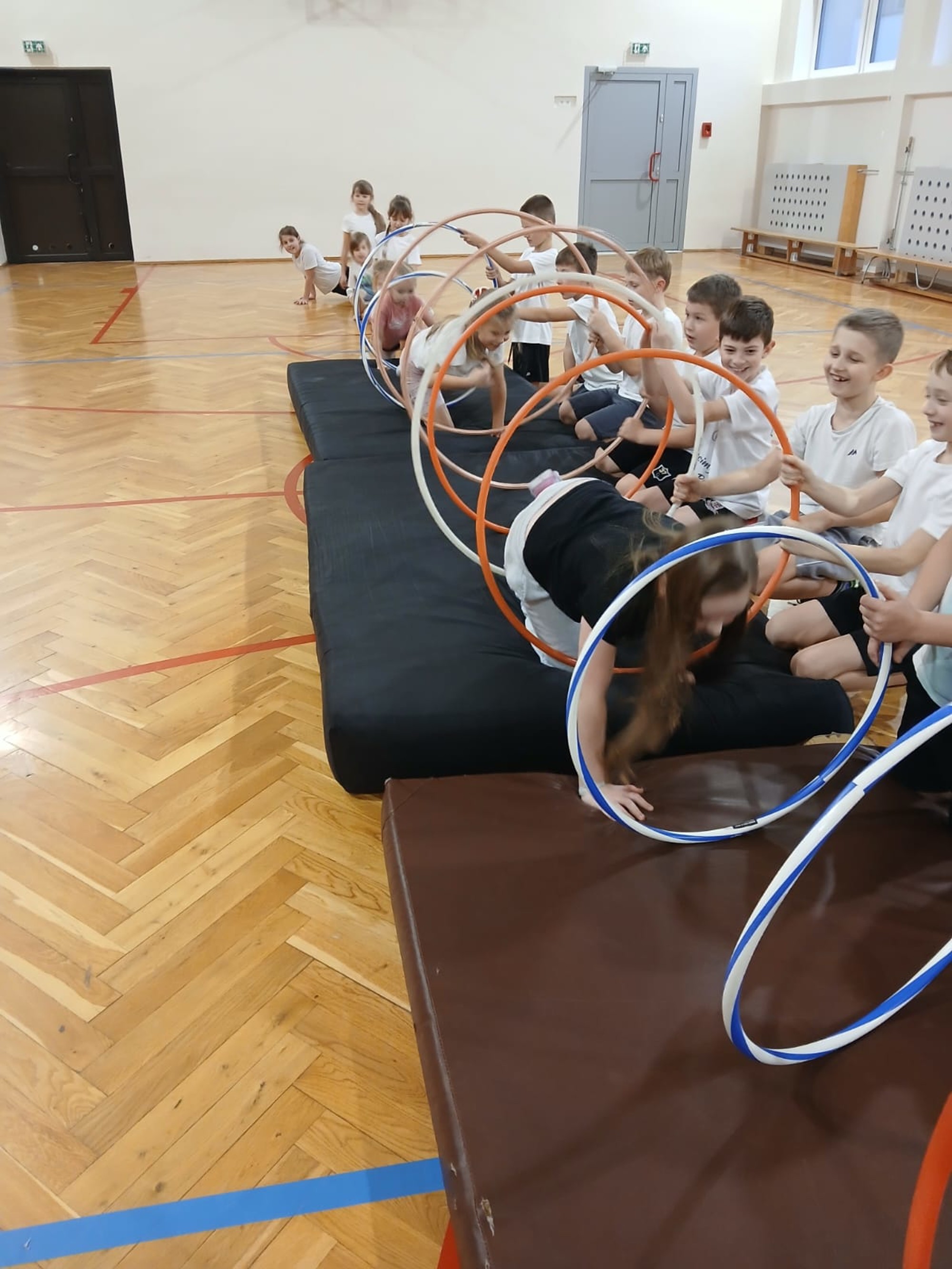W trakcie ćwiczeń wykorzystywane były różne przybory i przyrządy gimnastyczne, co urozmaicało zajęcia oraz pozwalało dzieciom zdobywać doświadczenia związane z bezpiecznym i świadomym korzystaniem ze sprzętu sportowego. Dzięki temu uczestnicy mogli nie tylko rozwijać sprawność, ale także budować pewność siebie i poczucie sprawczości.