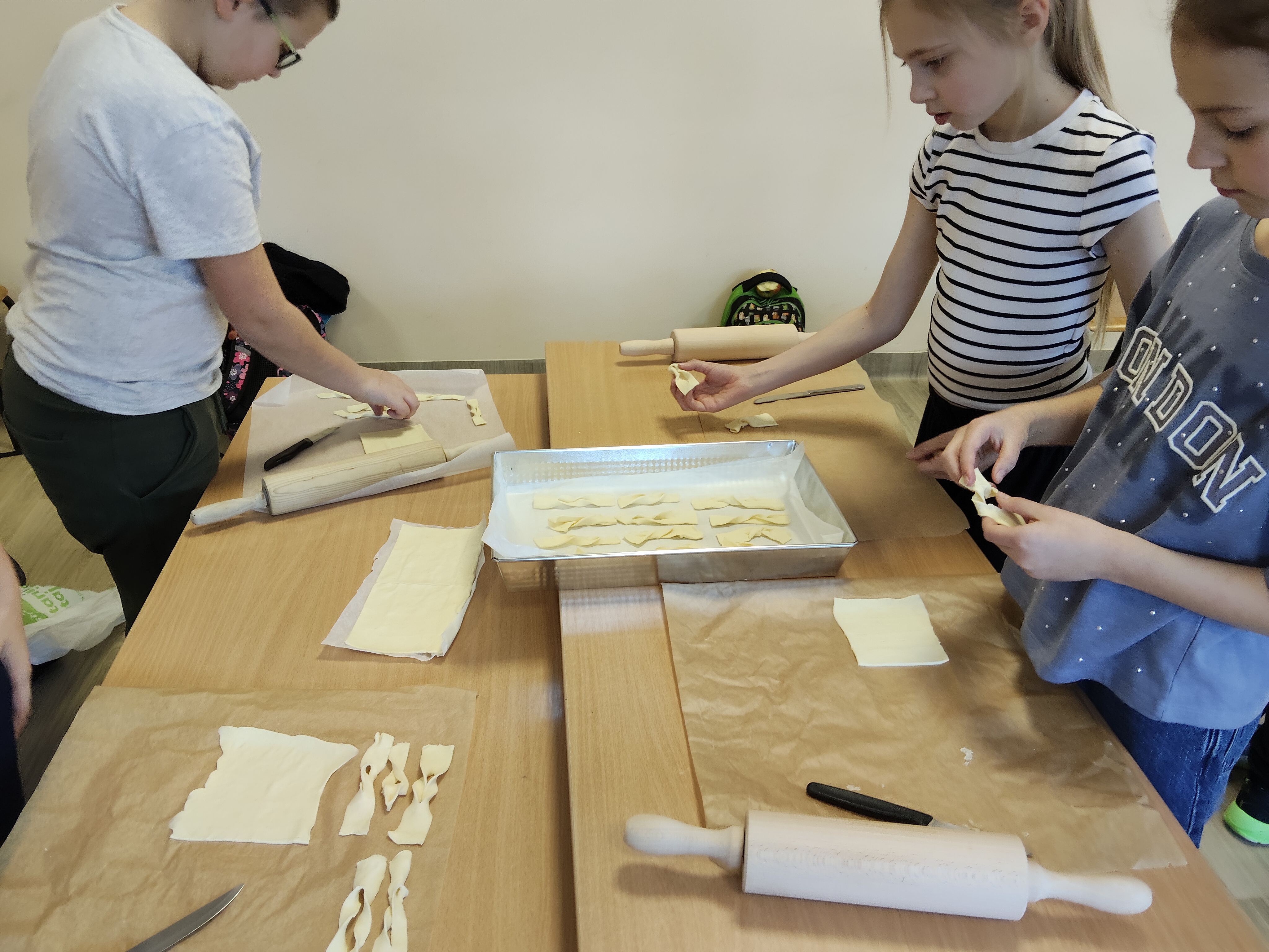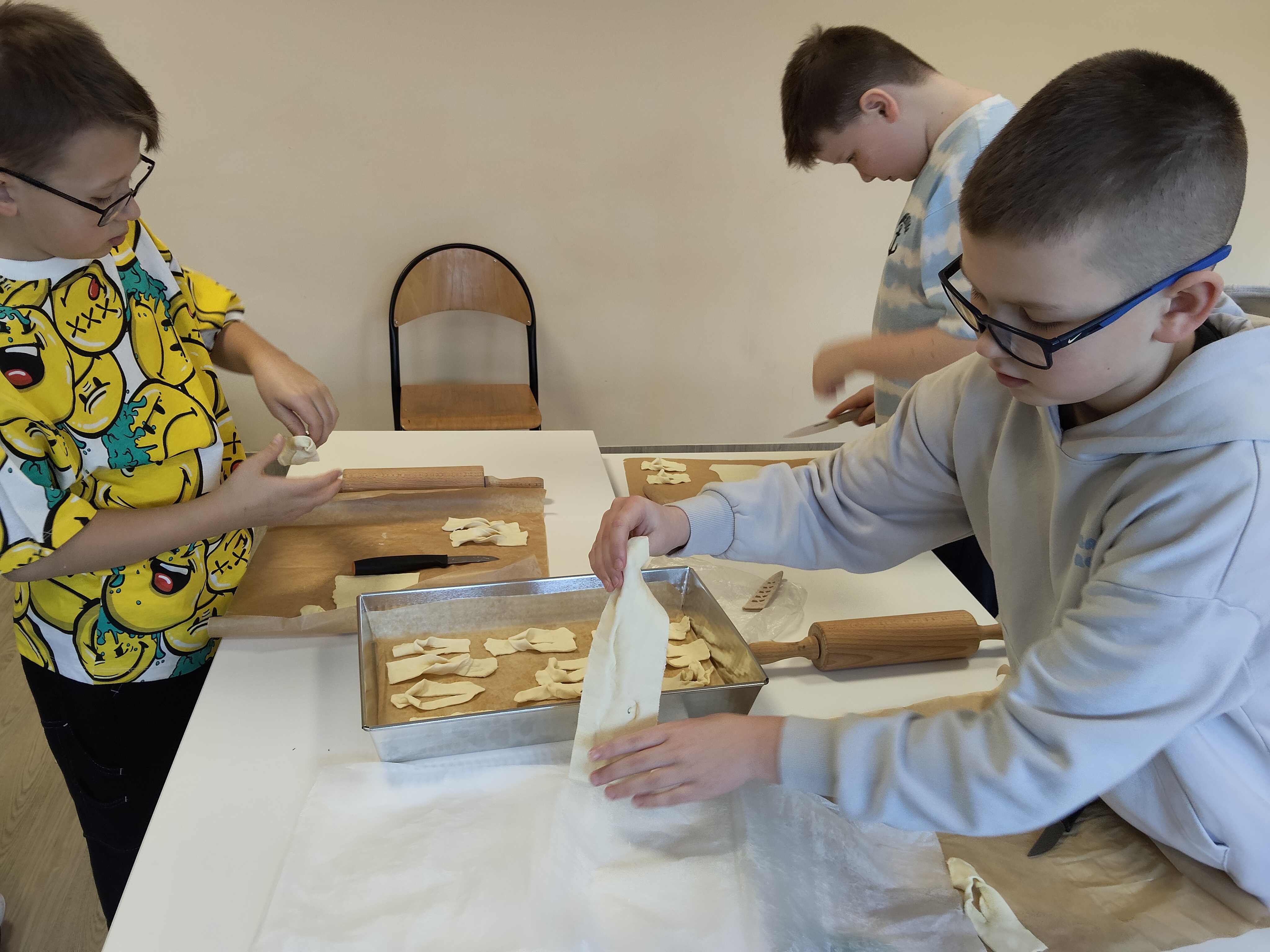 Dnia 27 stycznia 2026 r.  na zajęciach Małego kuchcika uczniowie z klasy 3 b z okazji karnawału przygotowali faworki z ciasta francuskiego. Pokrojone i zawinięte ciasto w formie faworków zostało upieczone w piekarniku. To zdrowsza, łatwa i szybka opcja na słodką przekąskę karnawałową. Faworki delikatnie posypane cukrem pudrem bardzo wszystkim smakowały.
