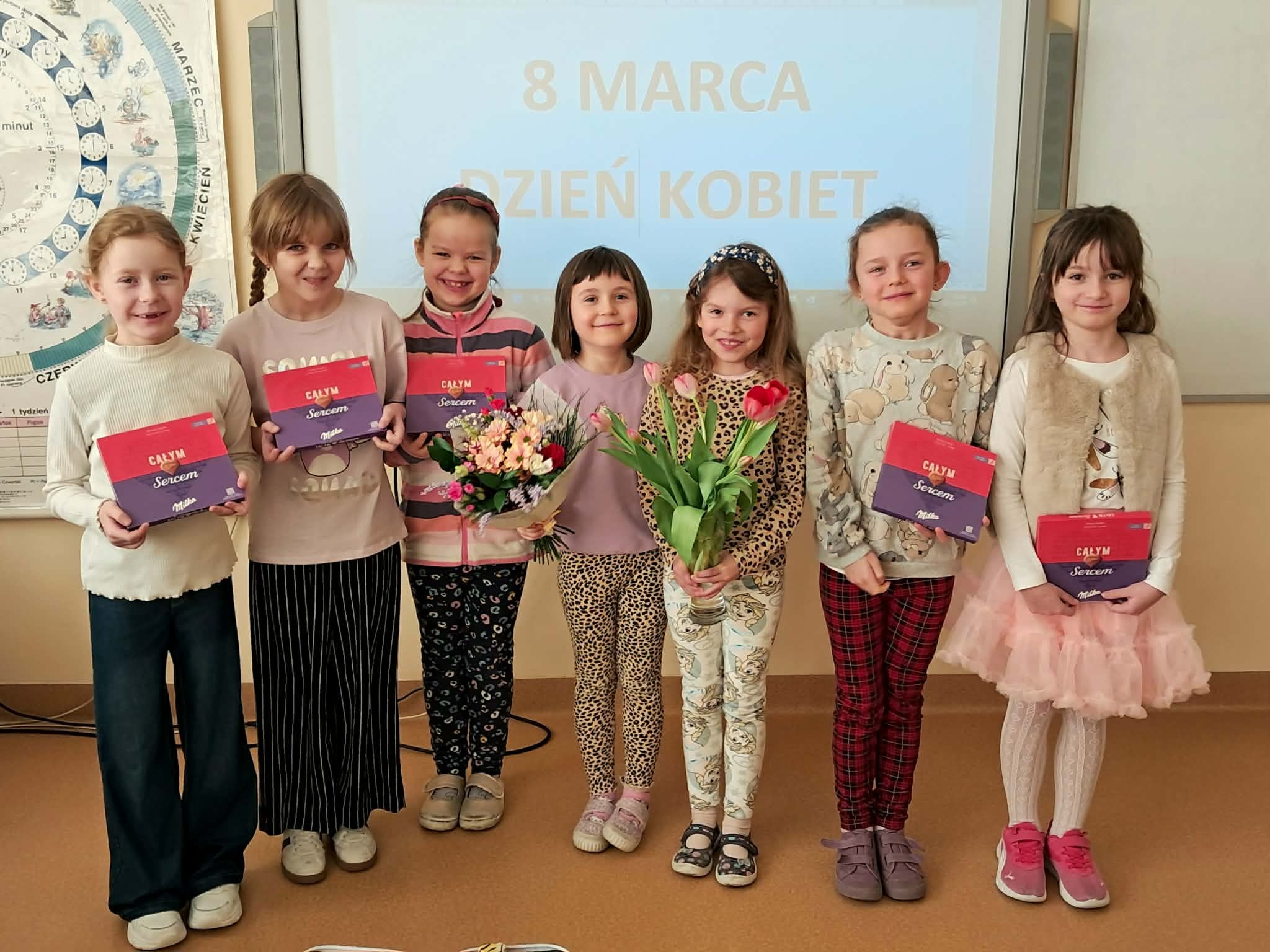W naszej szkole świętowanie rozpoczęło się już w piątek. Chłopcy pamiętali o swoich koleżankach i przygotowali dla dziewczynek miłą niespodziankę – wręczyli im kwiaty oraz słodkie upominki, dzięki czemu w szkole panowała bardzo radosna i serdeczna atmosfera.